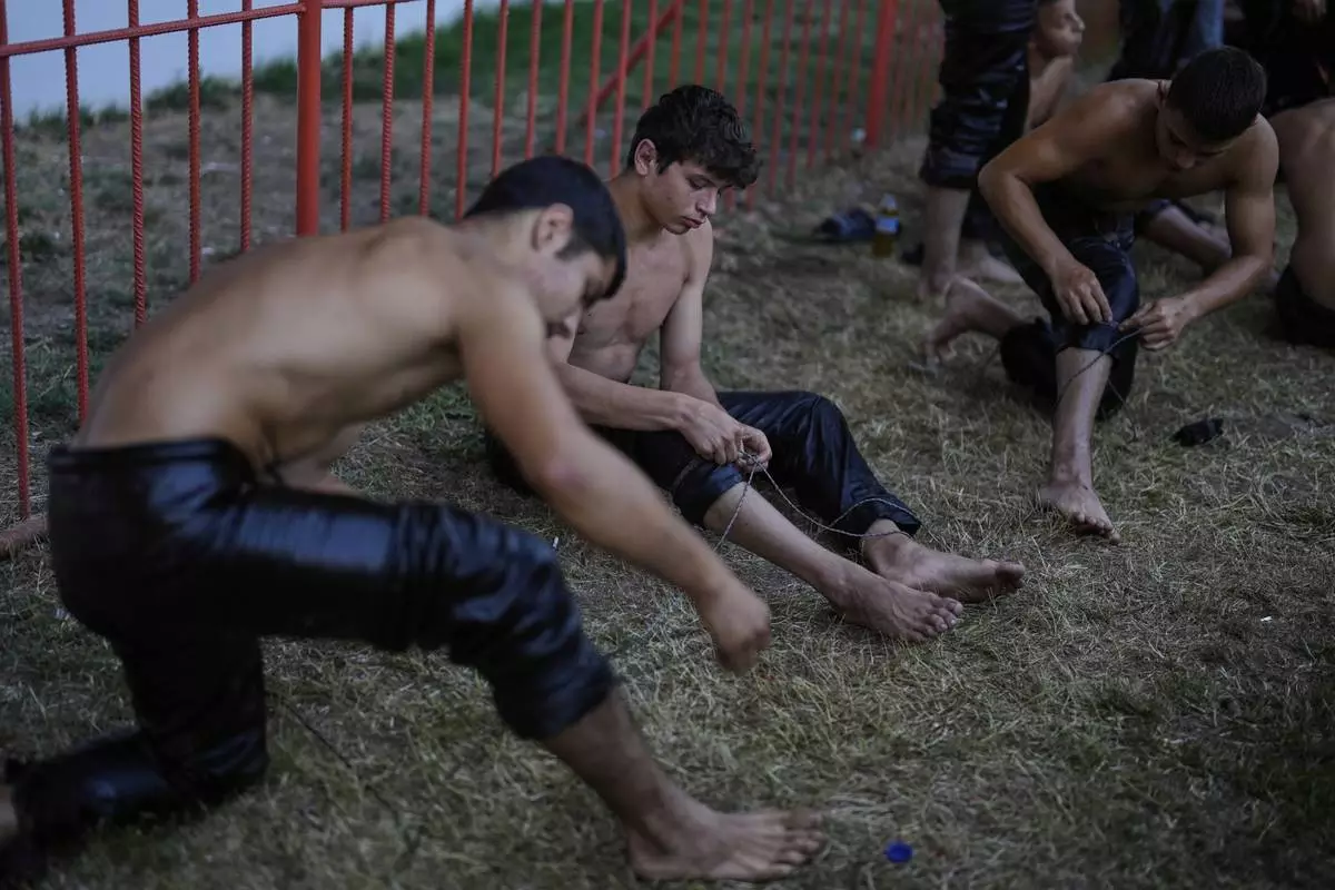Young wrestlers prepare as they wait for their turn to compete during the 664th annual Historic Kirkpinar Oil Wrestling Championship, in Edirne, northwestern Turkey, Sunday, July 6, 2025.(AP Photo/Khalil Hamra)