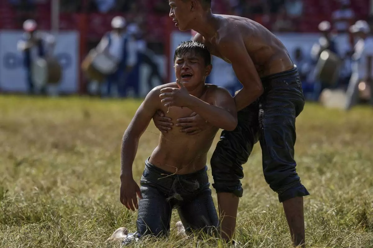 Alongside the men contesting, youngsters also don the iconic “kispet” leather trousers to embark on a slippery test of strength, skill and stamina under the scorching sun.