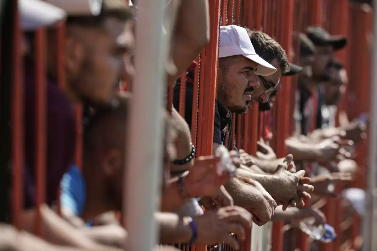 Spectators watch wrestling rounds during the 664th annual Historic Kirkpinar Oil Wrestling championship, in Edirne, northwestern Turkey, Sunday, July 6, 2025. (AP Photo/Khalil Hamra)