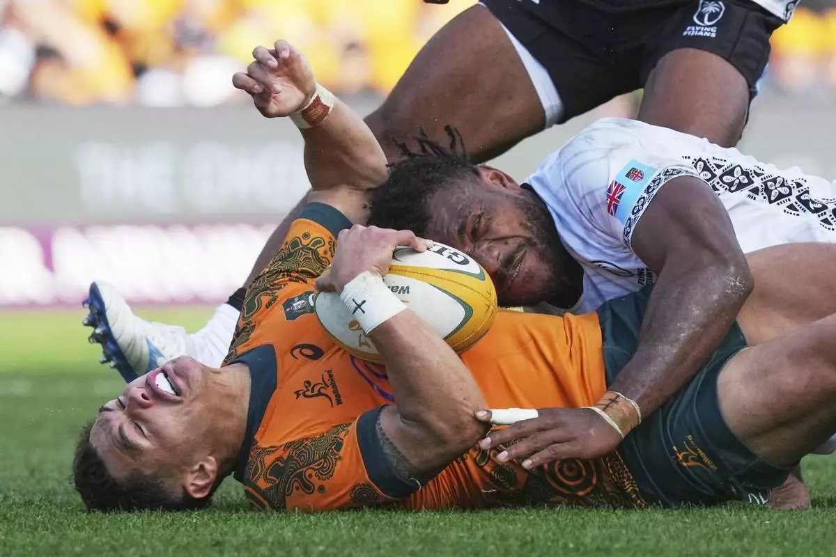 Australia's Noah Lolesio reacts as he is tackled during the rugby international between the Wallabies and Fiji in Newcastle, Australia, Sunday, July 6, 2025. (AP Photo/Mark Baker)