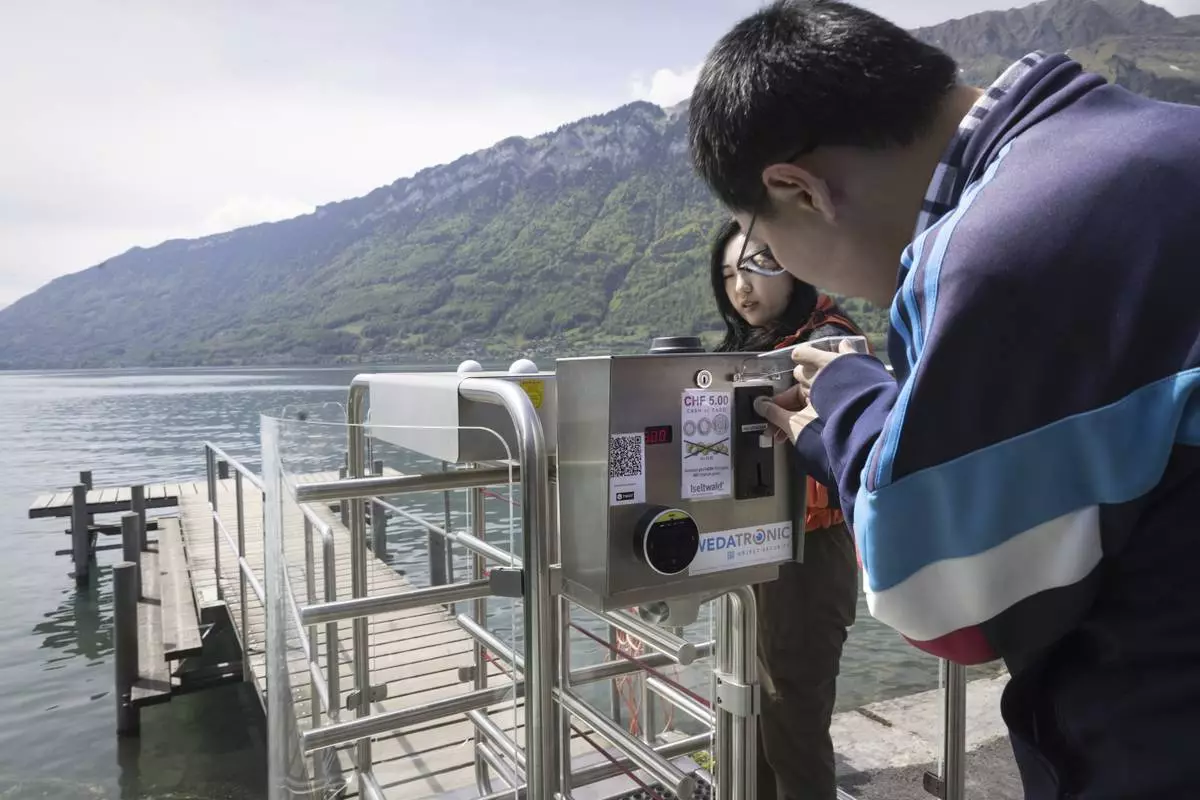 Korean visitors pay 5 Swiss Francs to get on the pier at Lake Brienz in Iseltwald, Switzerland, Sunday, May 21, 2023. (Peter Klaunzer/Keystone via AP)