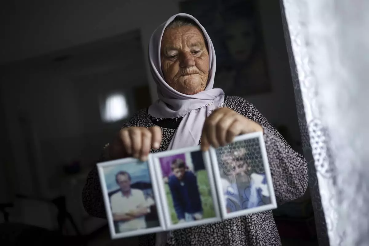 Saliha Osmanovic, 71, poses for a photo while holding pictures of her two sons and husband, victims of the Srebrenica genocide in the village of Dobrak near Srebrenica, Bosnia, on June 28, 2025. During the genocide a total of 38 members of her family were killed. (AP Photo/Armin Durgut)