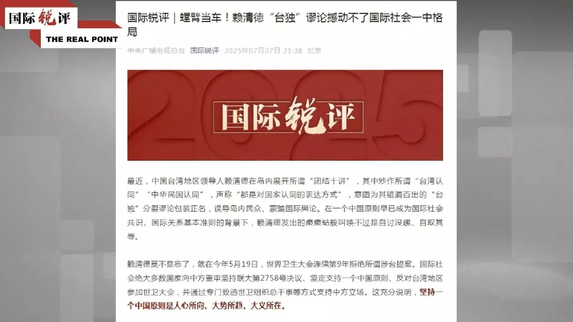The recent speeches made by leader of China's Taiwan region Lai Ching-te cannot shake the one-China principle universally recognized by the international community, a China Media Group (CMG) commentary said on Monday, slamming Lai's so-called "10 Lectures on Unity" campaign launched in recent days.