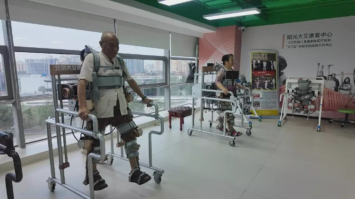 In an exoskeleton rehabilitation training center, some elderly volunteers were experiencing a walking assistance exoskeleton robot.