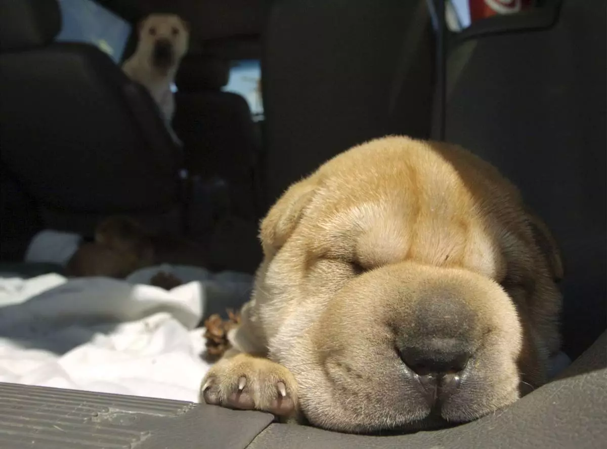 FILE - A Shar-Pei puppy naps in the back of a minivan in a parking lot in Kalispell, Mont., April 21, 2004. (Robin Loznak/Daily Inter Lake via AP, File)
