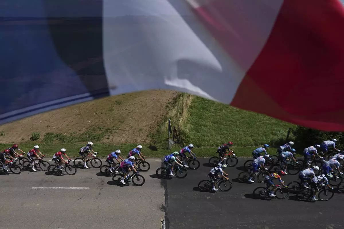 The pack rides under a French flag during the fourth stage of the Tour de France cycling race over 172.2 kilometers (107 miles) with start in Amiens and finish in Rouen, France, Tuesday, July 8, 2025. (AP Photo/Thibault Camus)