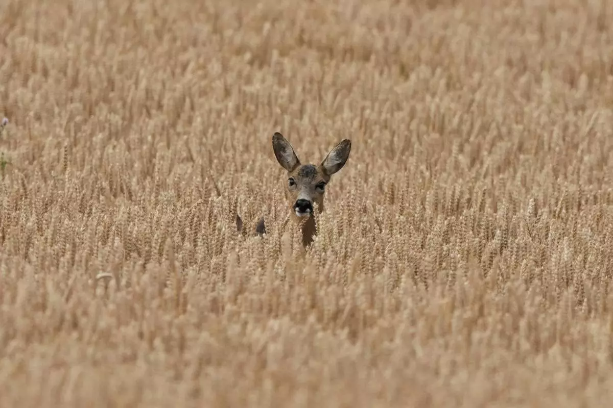 A deer and its baby stand in a cornfield in Neu-Anspach near Frankfurt, Germany, Tuesday, July 8, 2025. (AP Photo/Michael Probst)