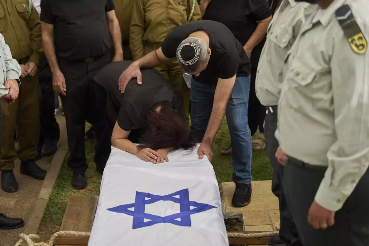 Aida, mother of Israeli reserve soldier Sergeant first class Benyamin Asulin ,28, who was killed in a battle in the Gaza Strip, mourns over his coffin during his funeral at the cemetery in Haifa, Israel, Tuesday, July 8, 2025. (AP Photo/Ariel Schalit)