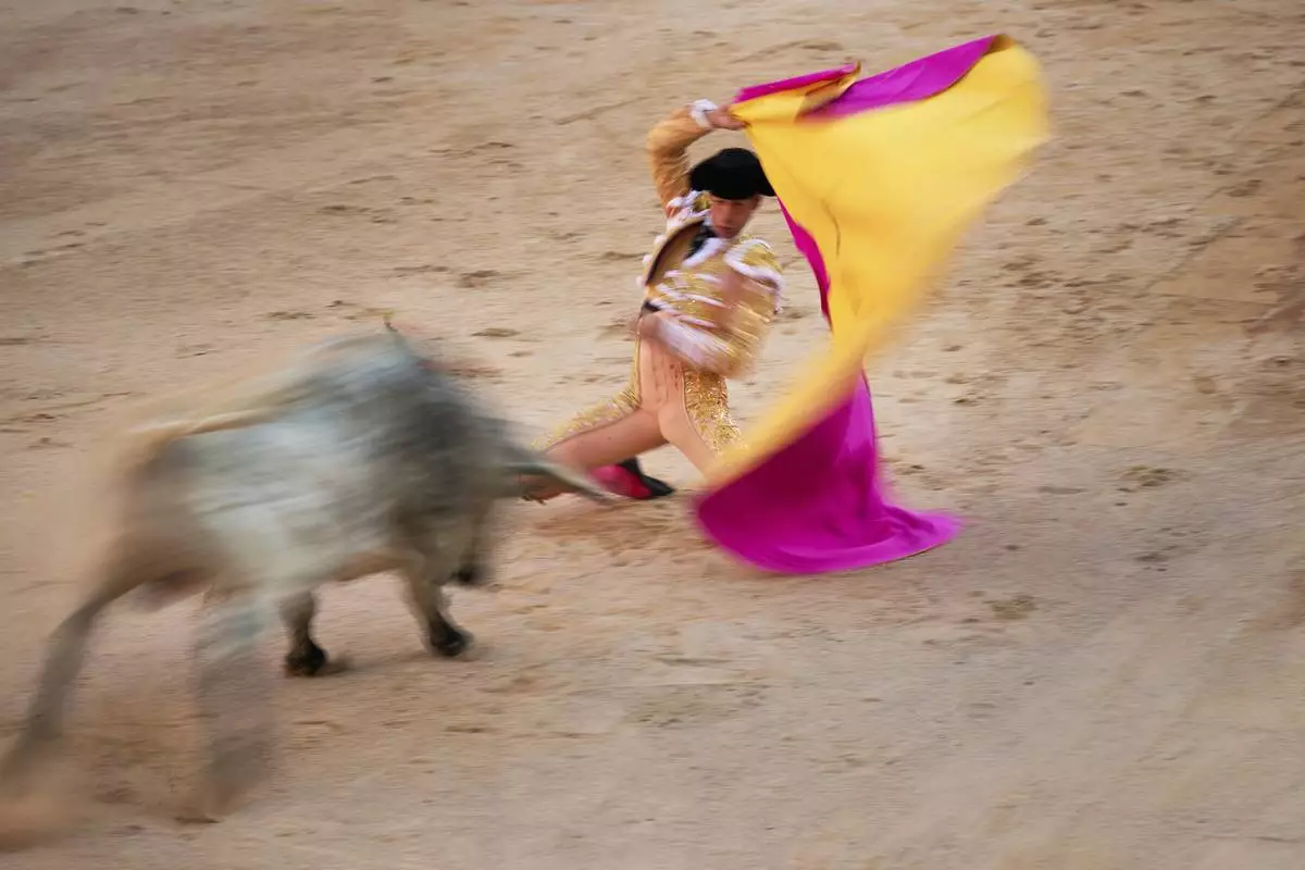 Spanish bullfighter Pepe Moral performs in a bullfight at the San Fermin Festival in Pamplona, northern Spain, on Tuesday July 8, 2025. (AP Photo/Miguel Oses)