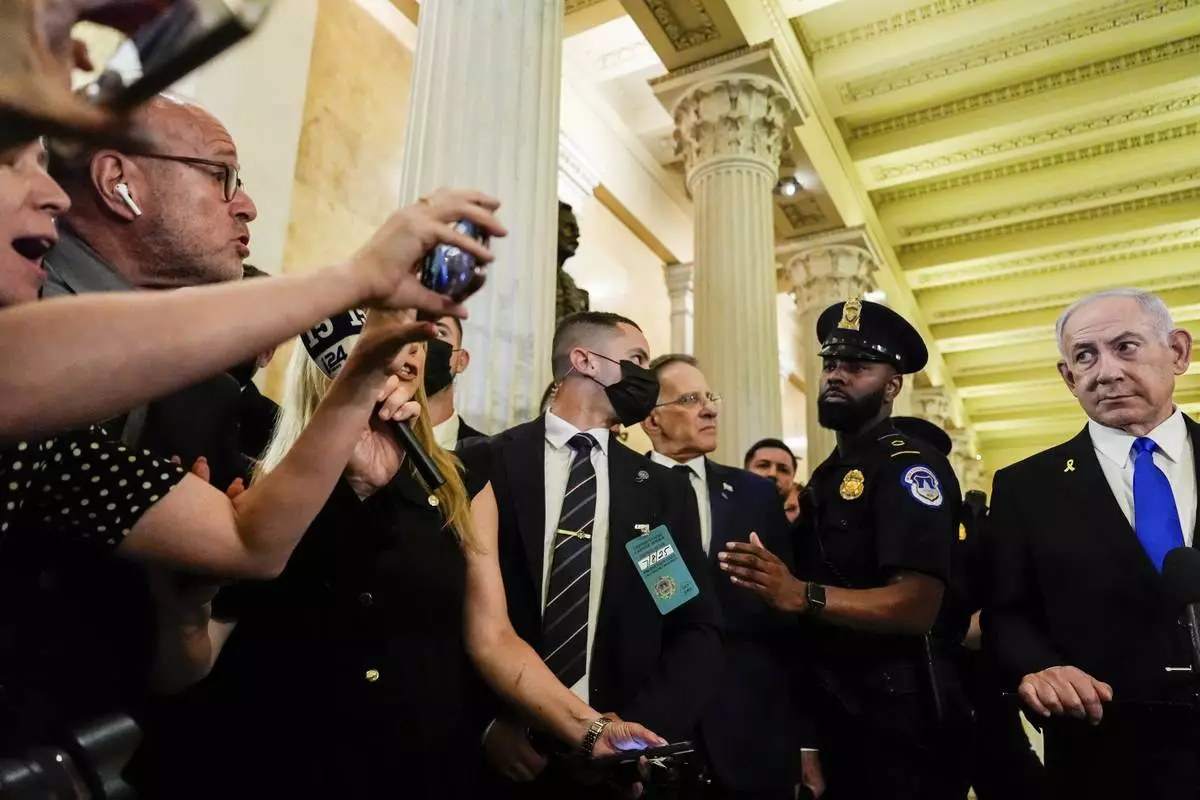 Israeli Prime Minister Benjamin Netanyahu speaks to reporters at the U.S. Capitol following a meeting with House Speaker Mike Johnson, R-La., Tuesday, July 8, 2025, in Washington. (AP Photo/Julia Demaree Nikhinson)