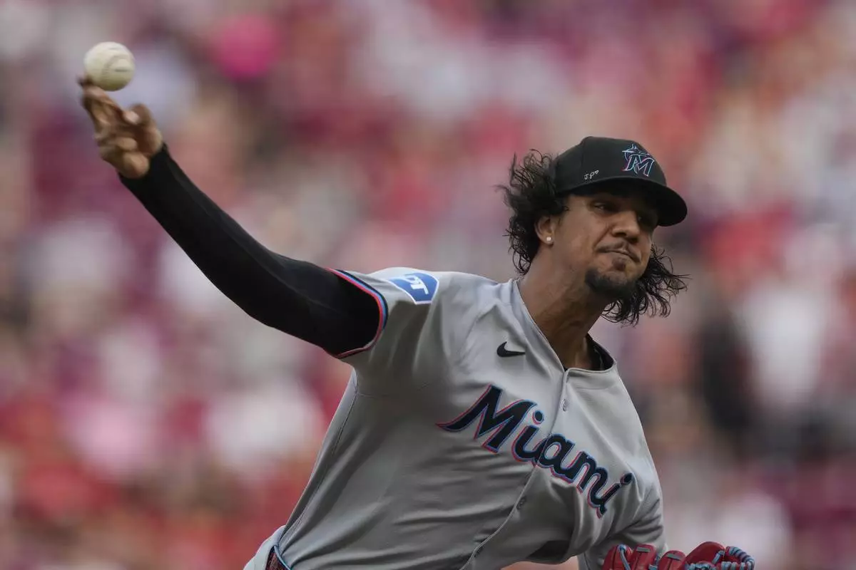 Miami Marlins pitcher Eury Pérez throws during the first inning of a baseball game against the Cincinnati Reds in Cincinnati, Tuesday, July 8, 2025. (AP Photo/Carolyn Kaster)