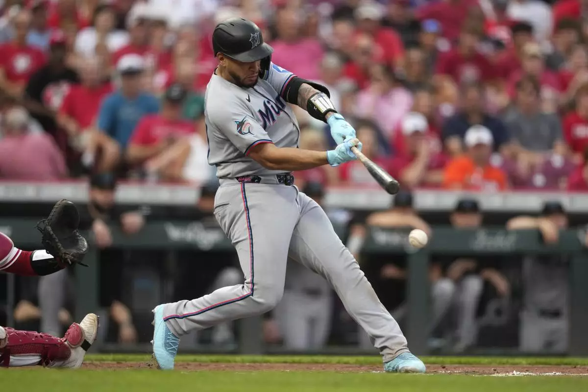 Miami Marlins' Agustín Ramírez doubles to score Jesús Sánchez during the third inning of a baseball game against the Cincinnati Reds in Cincinnati, Tuesday, July 8, 2025. (AP Photo/Carolyn Kaster)