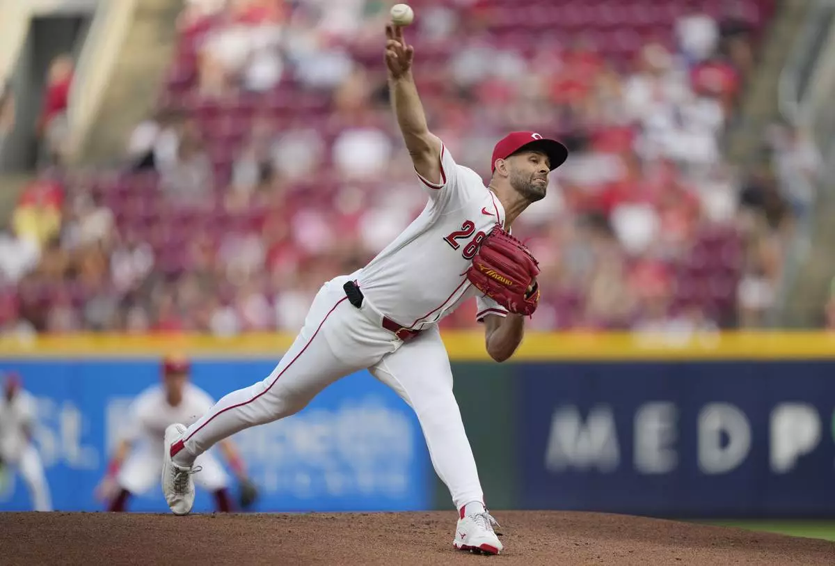 Cincinnati Reds pitcher Nick Martinez throws during the first inning of a baseball game against the Miami Marlins in Cincinnati, Tuesday, July 8, 2025. (AP Photo/Carolyn Kaster)