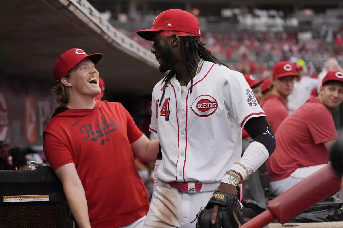 Cincinnati Reds pitcher Andrew Abbott, left, and shortstop Elly De La Cruz celebrate in the dugout as it was announced that Abbott will join De La Cruz as the Reds' representatives for the 2025 Major League Baseball All-Star Game, during the fourth inning of a baseball game against the Miami Marlins in Cincinnati, Tuesday, July 8, 2025. (AP Photo/Carolyn Kaster)