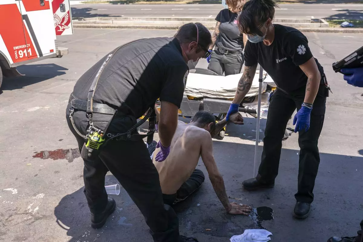 FILE - Salem Fire Department Capt. Matt Brozovich, left, and Falck Northwest ambulance personnel help treat a man experiencing heat exposure during a heat wave in Salem, Ore., June 26, 2021. (AP Photo/Nathan Howard, File)