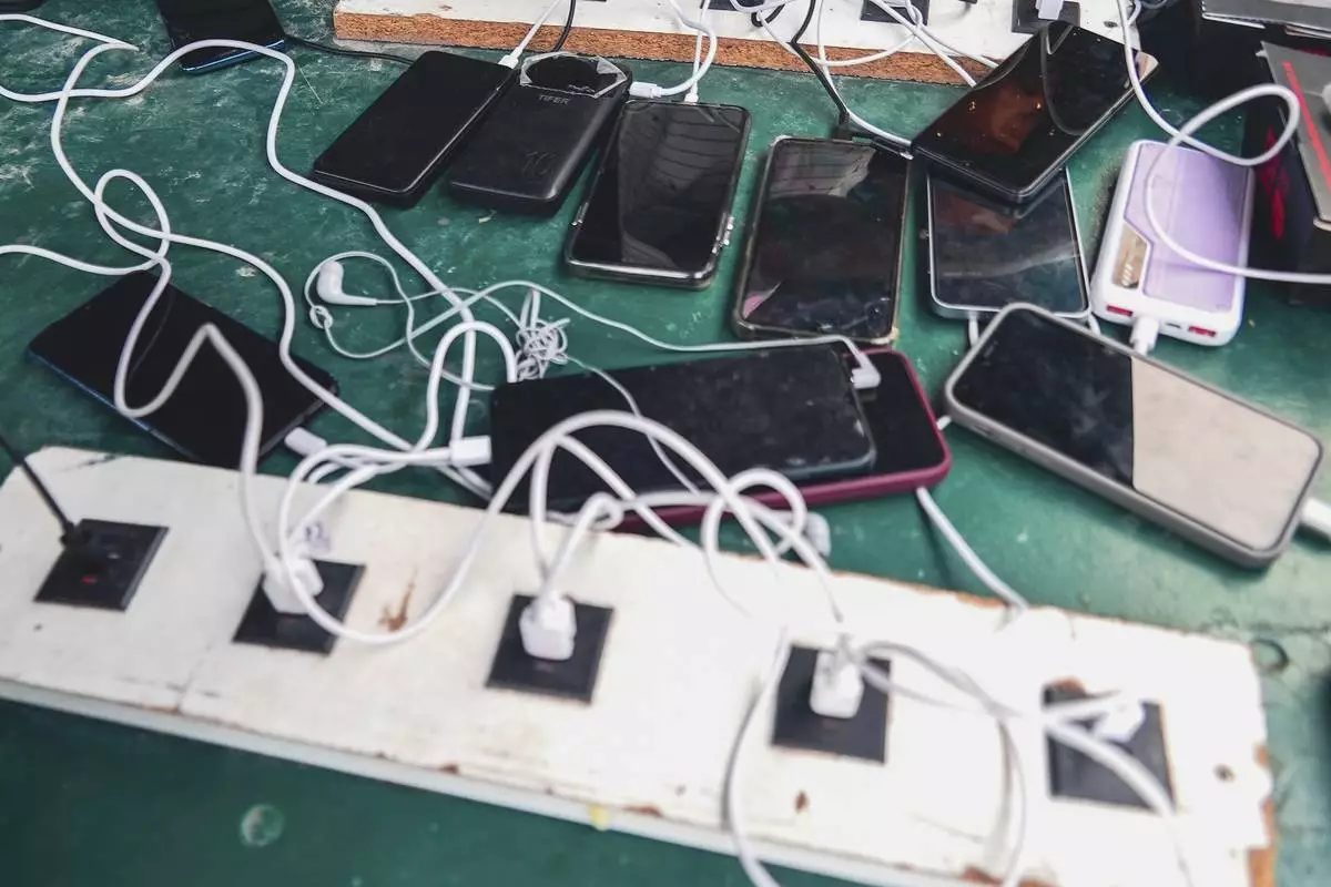 Phones are kept for charging at a Doctors Without Borders informal camp in Mardyck, northern France, Wednesday, July 2, 2025. (AP Photo/Nicolas Garriga)