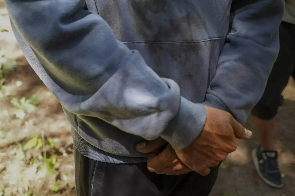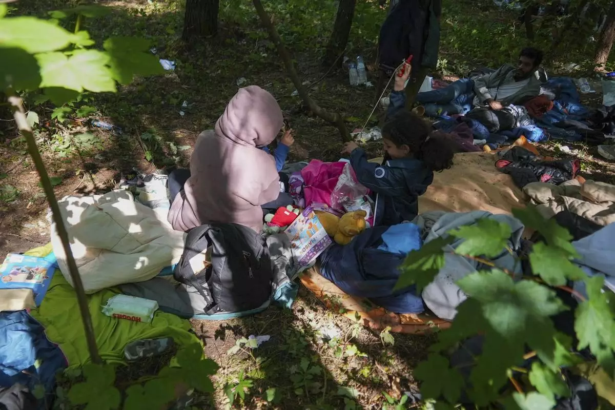 Migrants wait in the Ecault forest, northern France, Thursday, July 3, 2025. (AP Photo/Nicolas Garriga)