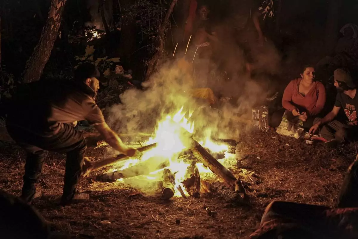 Migrants gather by a campfire in the Ecault forest, northern France, Friday, July 4, 2025. (AP Photo/Nicolas Garriga)