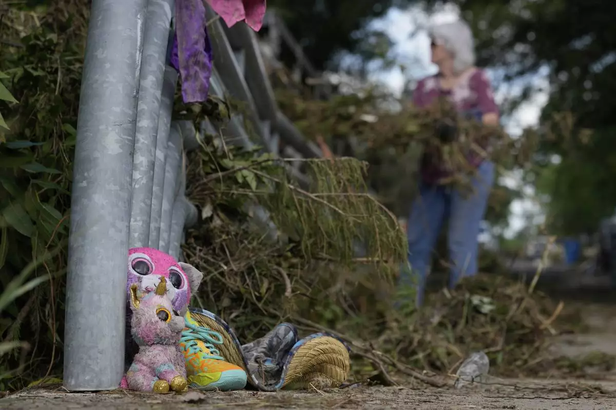 Lost items sit at a bridge as a volunteer cleans up debris on Tuesday, July 8, 2025, after a flash flood swept through the area in Kerrville, Texas. (AP Photo/Ashley Landis)