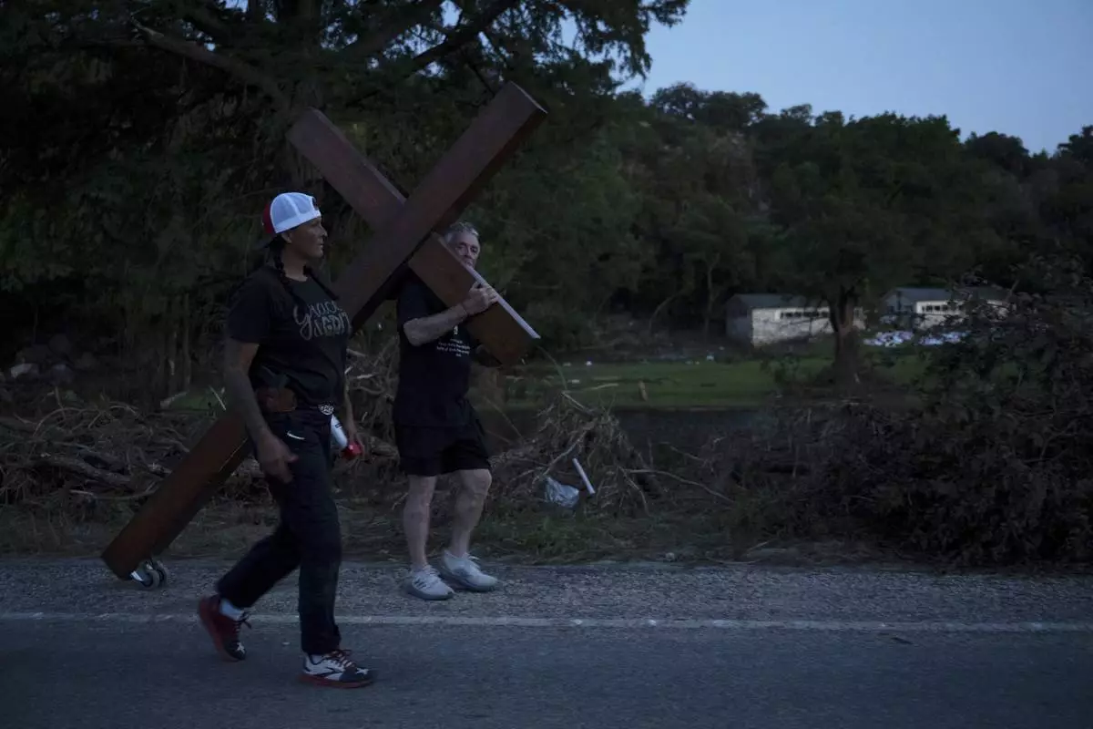 Disaster relief chaplain Sandi Gilmer, left, and Dan Beazley search for a permanent place for Beazley's large cross in memory of flooding victims on Tuesday, July 8, 2025, near Camp Mystic in Hunt, Texas, after a flash flood swept through the area. (AP Photo/Eli Hartman)