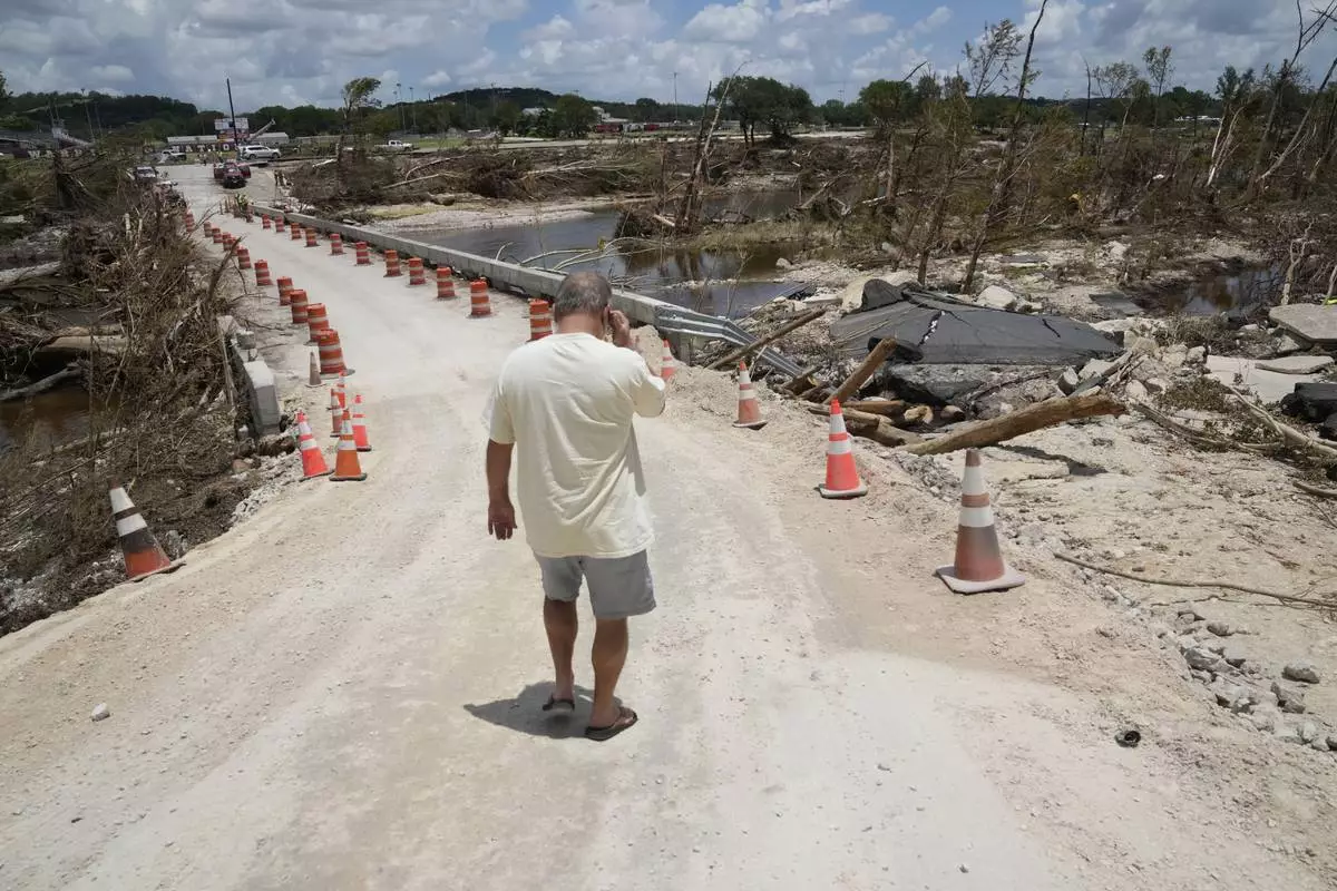 Resident Paul Snyder walks down the road to check out the condition of the bridge along the Guadalupe River after flooding in Ingram, Texas on Wednesday , July 9, 2025. (AP Photo/Gerald Herbert)