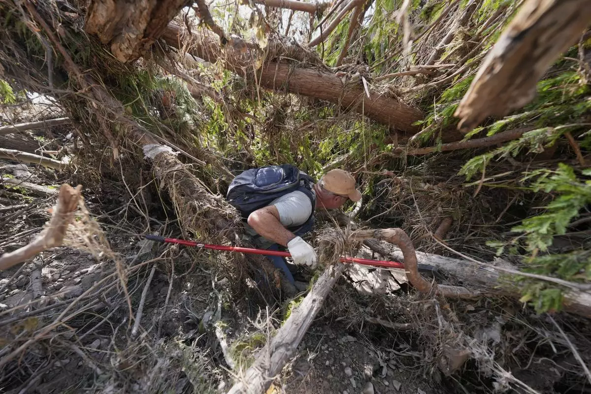 People search along the Guadalupe River after flooding in Kerrville, Texas on Wednesday , July 9, 2025. (AP Photo/Gerald Herbert)