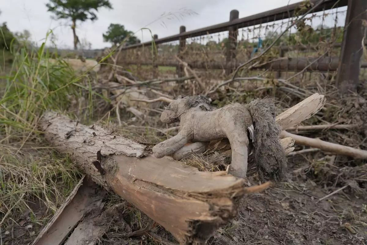 A toy horse lies by a fallen tree limbs and debris in Kerrville, Texas, Wednesday, July 9, 2025, after flooding. (AP Photo/Ashley Landis)