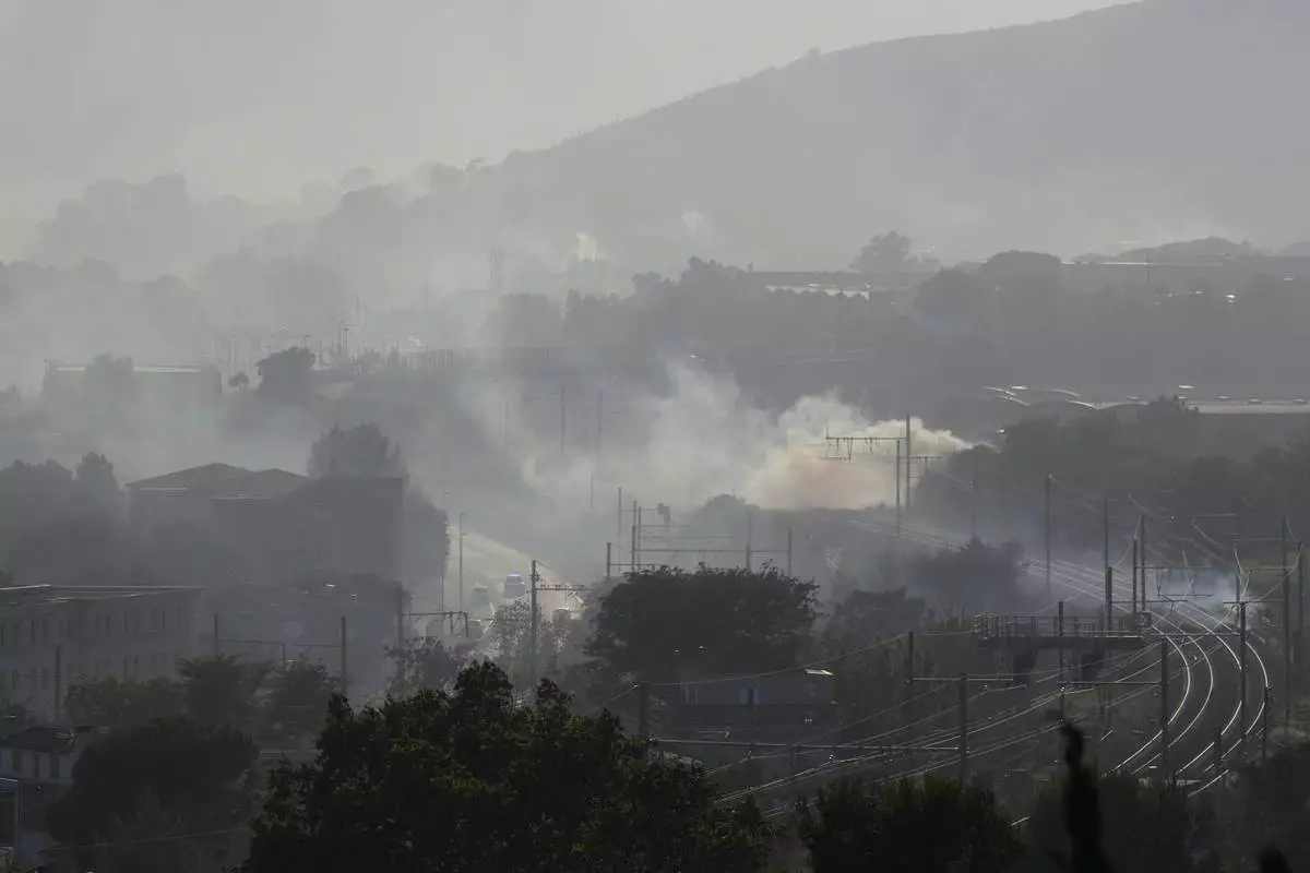 Smoke is seen by rail tracks during a wildfire Tuesday, July 8, 2025 in Marseille, southern France. (AP Photo/Lewis Joly)