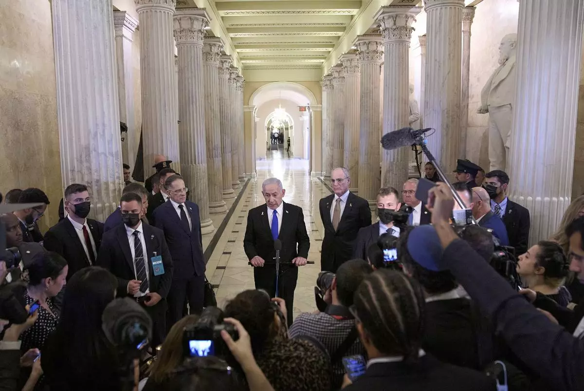 Israeli Prime Minister Benjamin Netanyahu speaks to the media, Tuesday, July 8, 2025, on Capitol Hill in Washington. (AP Photo/Jacquelyn Martin)