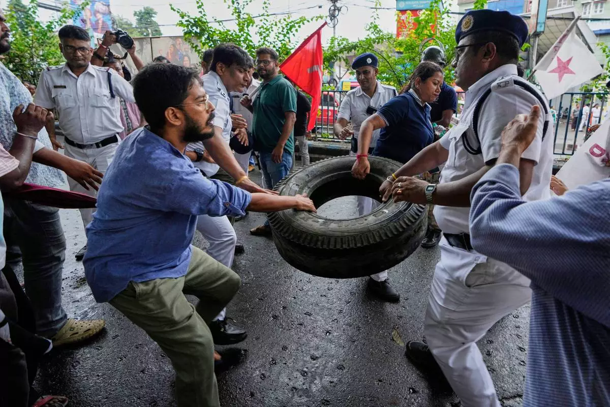Policemen snatch a car tire that was used to make a road block from a supporter of Centre of India Trade Unions, CITU, during a nation-wide strike to protest what they call the anti-labor and anti-poor policies of the federal government, in Kolkata, India, Wednesday, July 9, 2025. (AP Photo/Bikas Das)