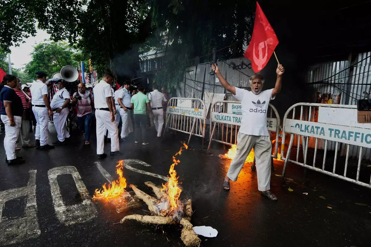 A supporter of Centre of India Trade Unions, CITU, shouts slogans as an effigy of Indian Prime Minister burns during a nation-wide strike to protest what they call the anti-labor and anti-poor policies of the federal government, in Kolkata, India, Wednesday, July 9, 2025. (AP Photo/Bikas Das)