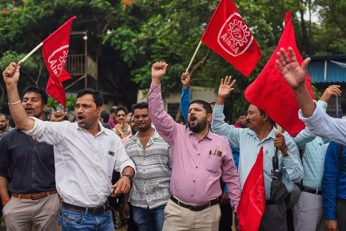 Bank employees shout slogans against privatization of public sector banks during a country-wide strike in Mumbai, India, , Wednesday, July 9, 2025. (AP Photo/ Rafiq Maqbool)