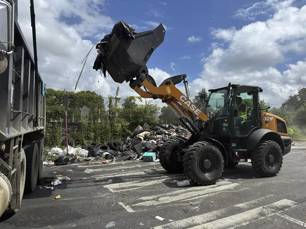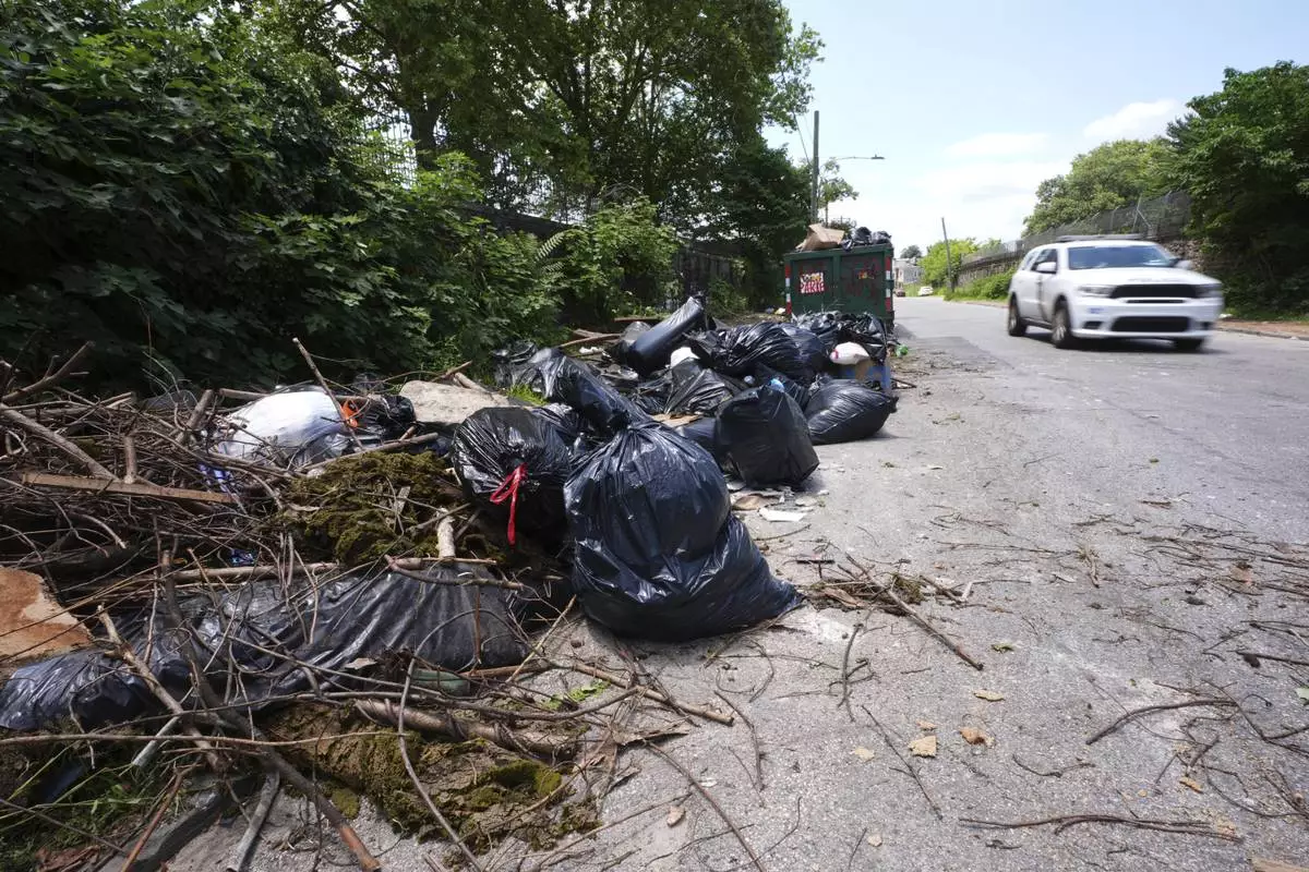 Trash is cleaned up at a drop-off site in Philadelphia as thousands of city workers remained on strike Monday, July 7, 2025. (AP Photo/Tassanee Vejpongsa)