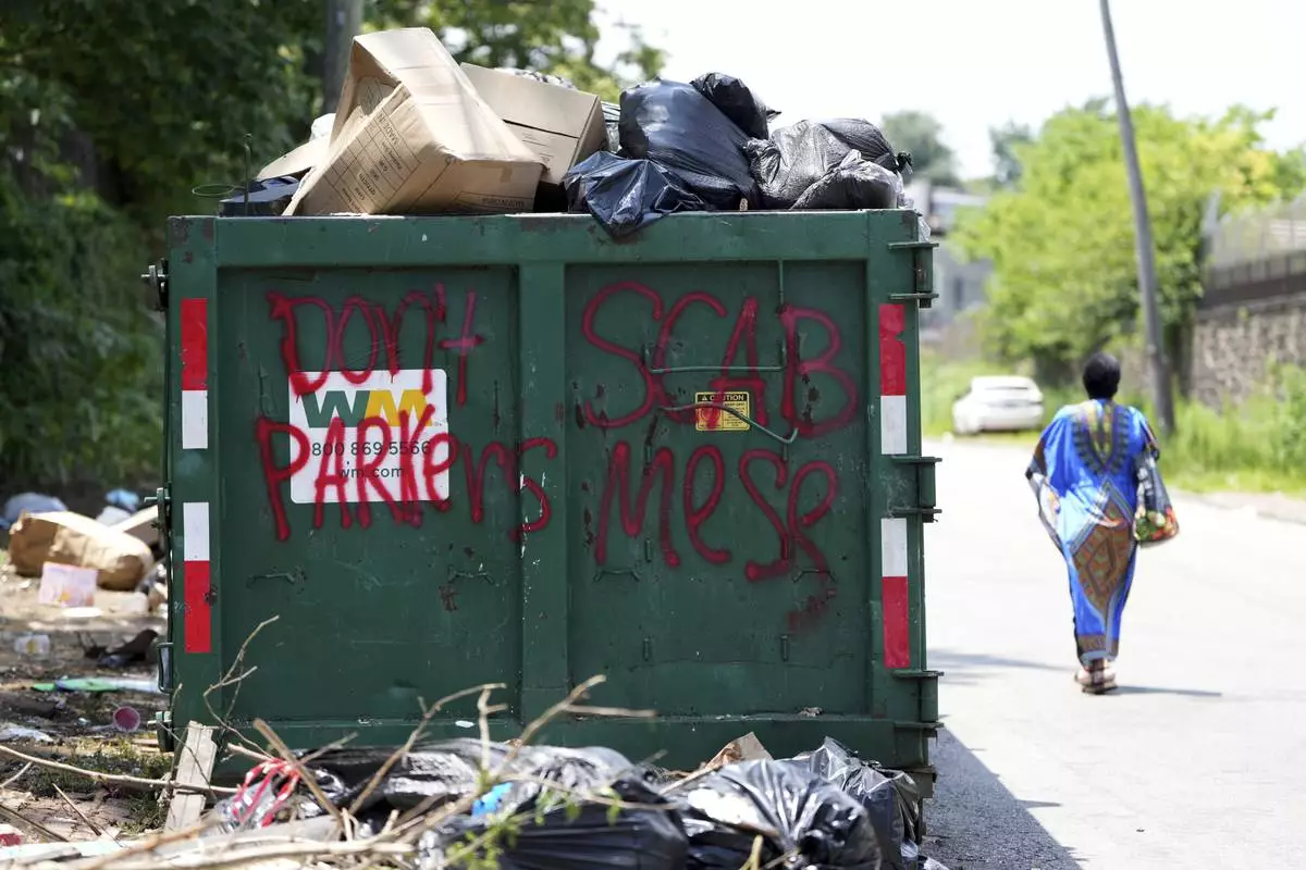 Trash piles up around dumpsters in Philadelphia as thousands of city workers remained on strike Monday, July 7, 2025. (AP Photo/Tassanee Vejpongsa)