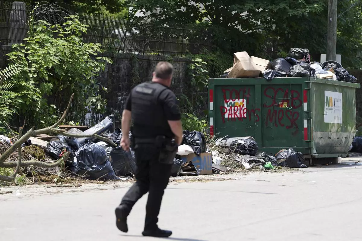 A police officer walks past a garbage collection site, Wednesday, July 9, 2025, in Philadelphia. (AP Photo/Matt Slocum)