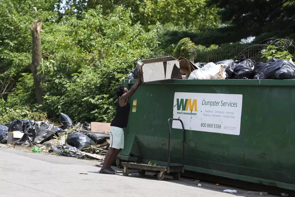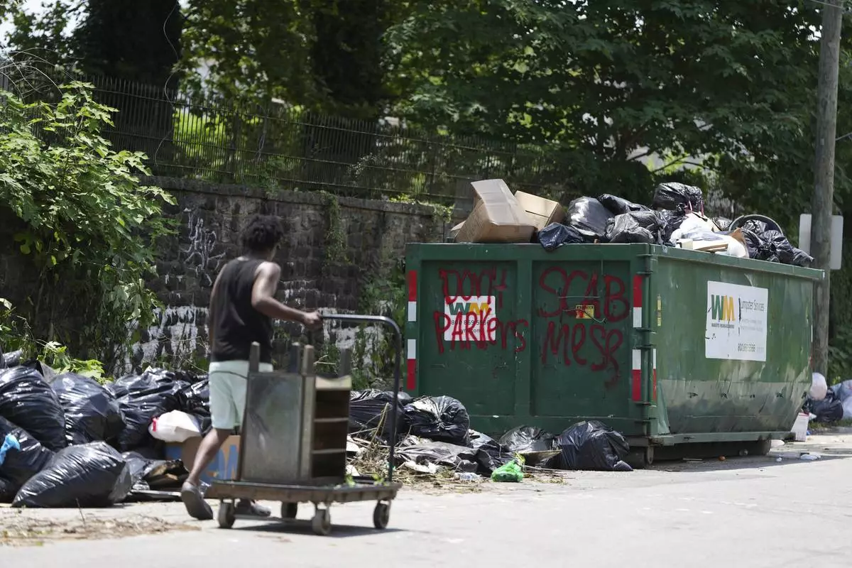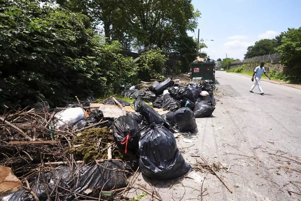 A man takes trash to a garbage collection site, Wednesday, July 9, 2025, in Philadelphia. (AP Photo/Matt Slocum)