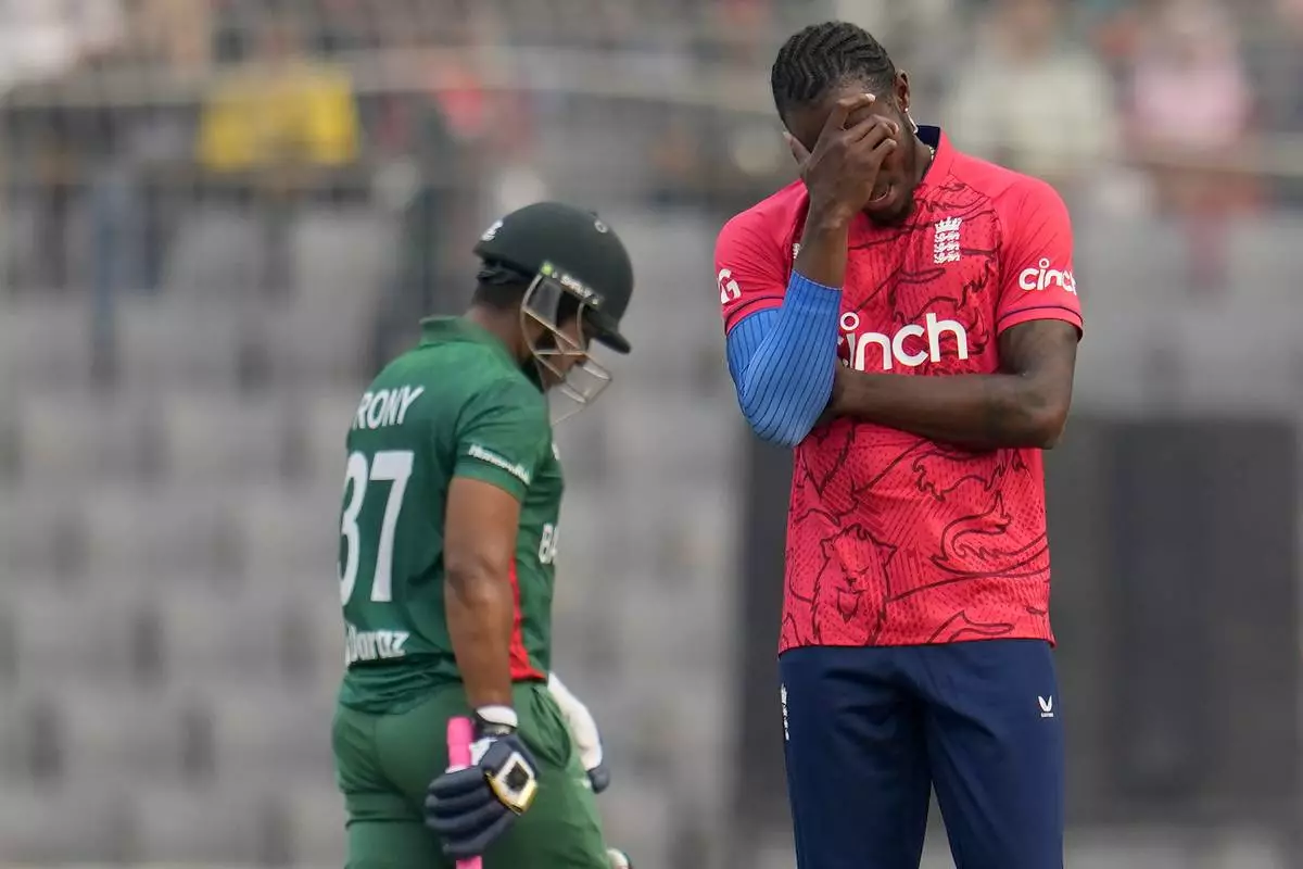 FILE - England's Jofra Archer, center, reacts after teammate Rehan Ahmed dropped a catch of Bangladesh's Rony Talukdar, left, during the third and last T20 cricket match between Bangladesh and England in Dhaka, Bangladesh, Tuesday, March 14, 2023. (AP Photo/Aijaz Rahi, File)
