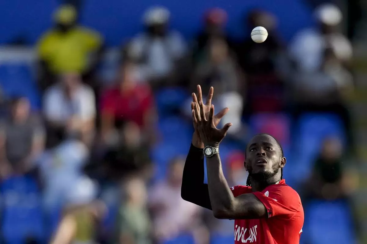 FILE - England's Jofra Archer receives the ball to bowl against Namibia during an ICC Men's T20 World Cup cricket match at Siv Vivian Richards Stadium in North Sound, Antigua and Barbuda, Saturday, June 15, 2024. (AP Photo/Ricardo Mazalan, File)
