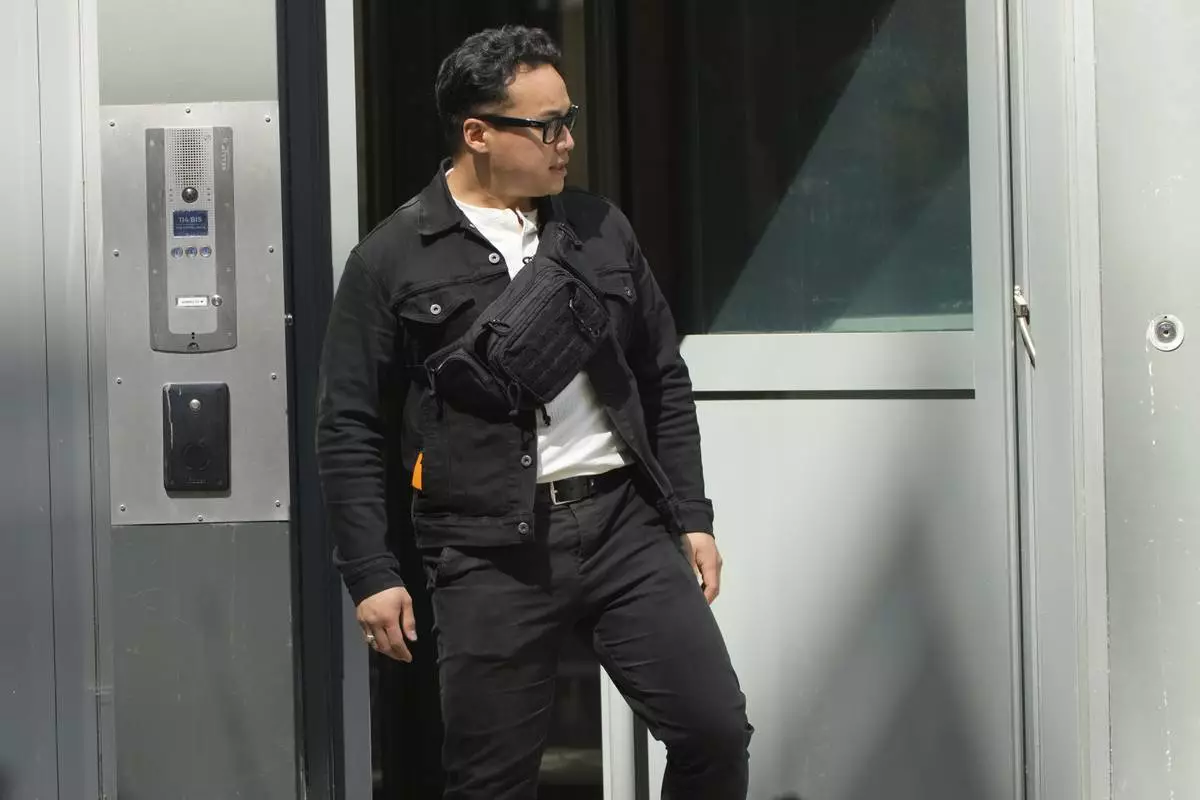 A police officer leaves the National Rally headquarters as French police raids the headquarters of far-right party, seizing documents and accounting records, the party's leader said Wednesday, July 9, 2025 in Paris. (AP Photo/Michel Euler)
