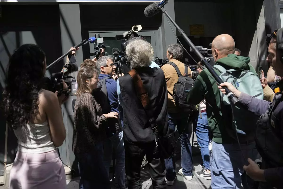 Members of the press gather at the National Rally headquarters as French police raids the headquarters of far-right party, seizing documents and accounting records, the party's leader said Wednesday, July 9, 2025 in Paris. (AP Photo/Michel Euler)