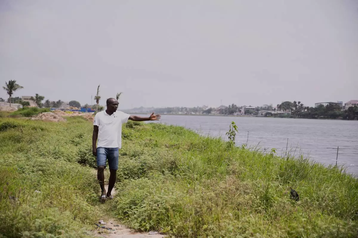Koutoglo Kossi Mawuli, points at the lagoon where the body of Jacques Koami Koutoglo, was recovered in Lome, Togo, Monday, July 7, 2025. (AP Photo/Erick Kaglan)