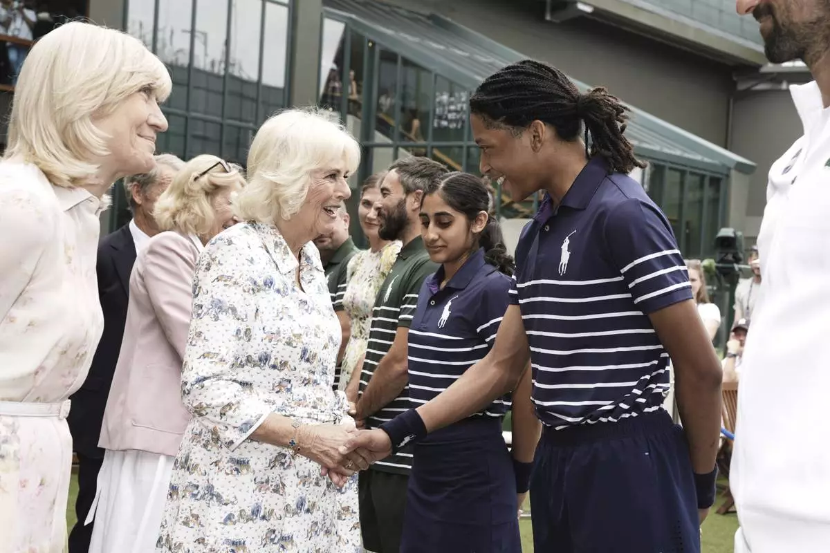 Earlier, Camilla spoke to seven-time Wimbledon champion Novak Djokovic and met lead groundsperson Will Brierley, lead gardener Robin Murphy, heritage collections manager Malin Lundin, as well as a ball girl and ball boy.
