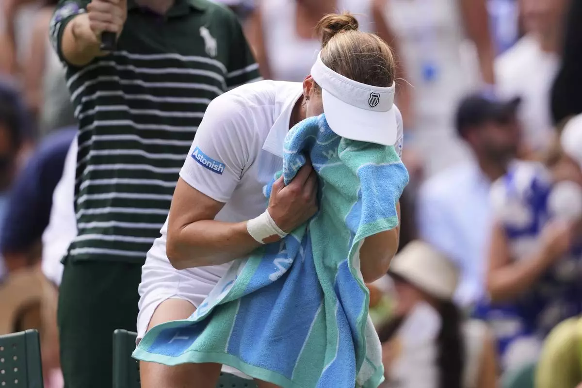 Liudmilla Samsonova of Russia wipes her face with a towel during the women's singles quarter final match against Iga Swiatek of Poland at the Wimbledon Tennis Championships in London, Wednesday, July 9, 2025.(AP Photo/Kirsty Wigglesworth)