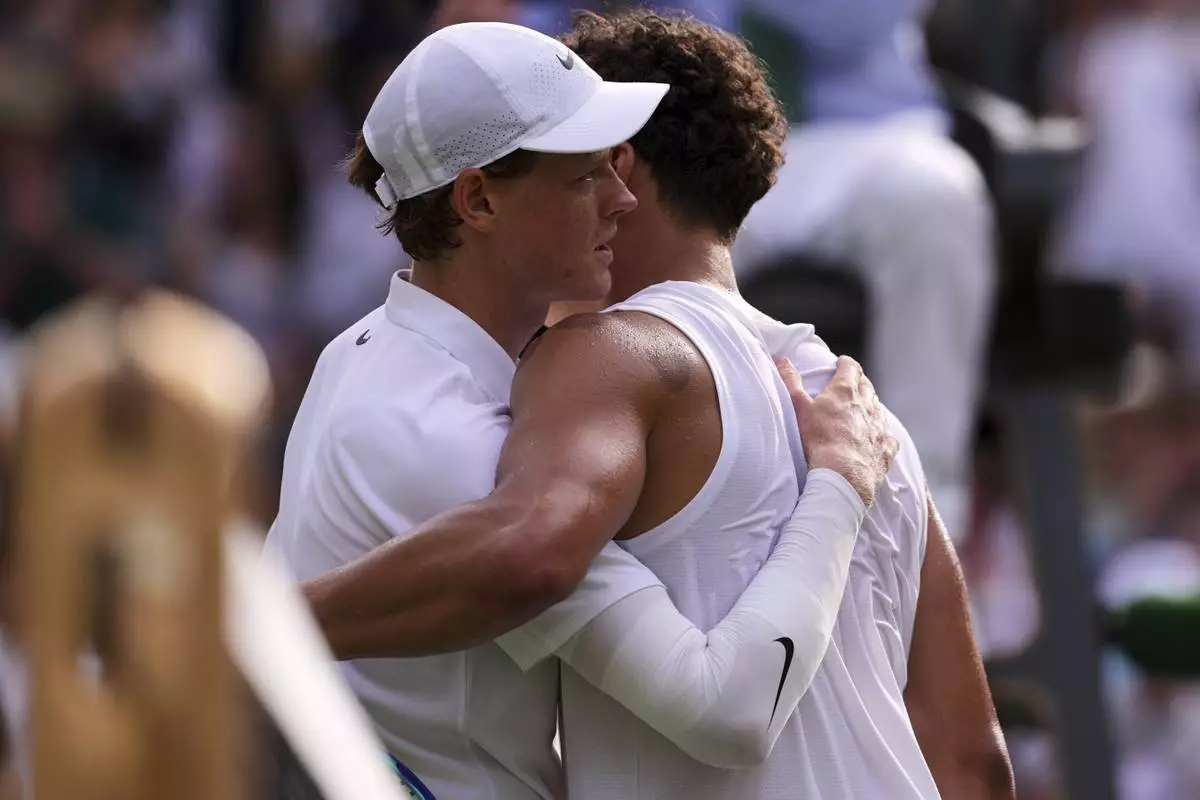Jannik Sinner of Italy and Ben Shelton of the U.S. hug after the men's singles quarter final match at the Wimbledon Tennis Championships in London, Wednesday, July 9, 2025.(AP Photo/Kirsty Wigglesworth)