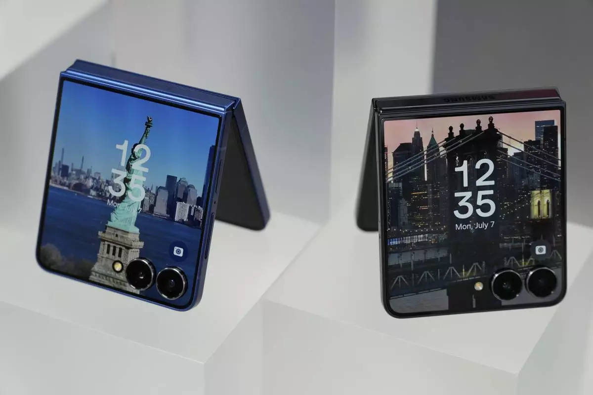 The new Galaxy Z Flip 7 is displayed during a Samsung preview event in New York, Monday, July 7, 2025. (AP Photo/Seth Wenig)