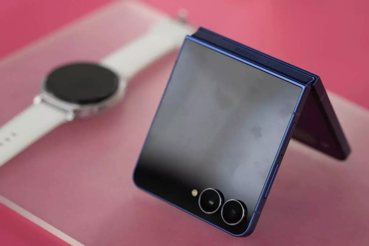 The new Galaxy Z Flip 7 and a smart watch are displayed during a Samsung preview event in New York, Monday, July 7, 2025. (AP Photo/Seth Wenig)