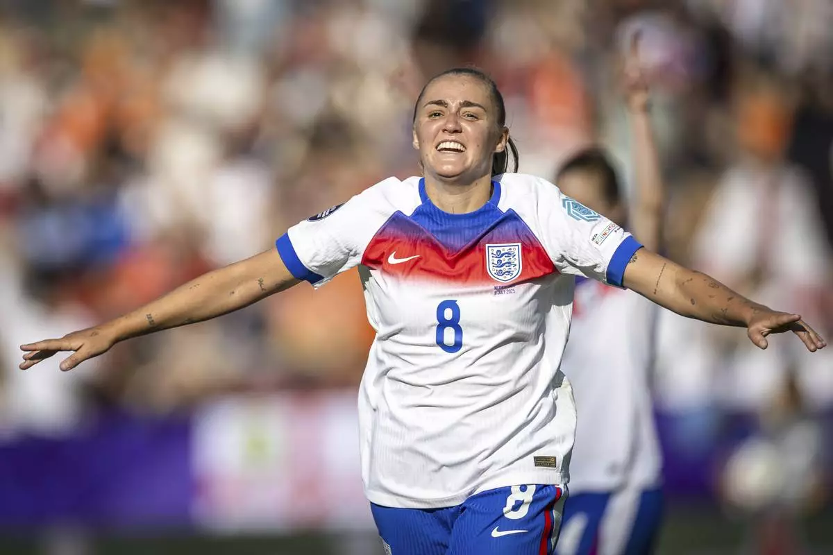 England's Georgia Stanway celebrates after scoring her side's second goal during the Euro 2025, group D, soccer match between England and the Netherlands in Zurich, Switzerland, Wednesday, July 9, 2025. (Michael Buholzer/Keystone via AP)