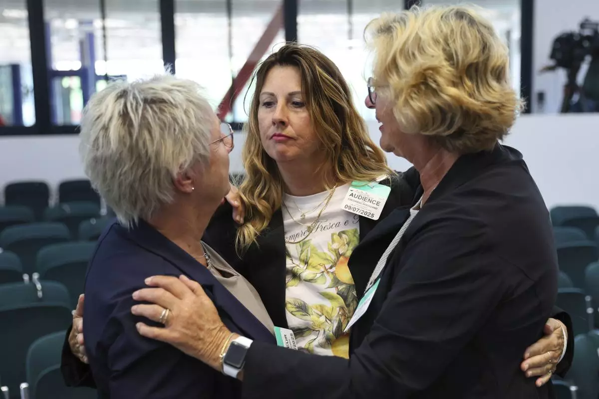 Netherlands' Silene Fredriksz-Hoogzand, center, whose son died in in the MH17 crash, hugs other plaintiffs after the European Court of Human Rights issued its judgment on Russian violations in Ukraine since 2014, including the downing of Malaysia Airlines flight MH17, Wednesday, July 9, 2025 in Strasbourg, eastern France. (AP Photo/Antonin Utz)