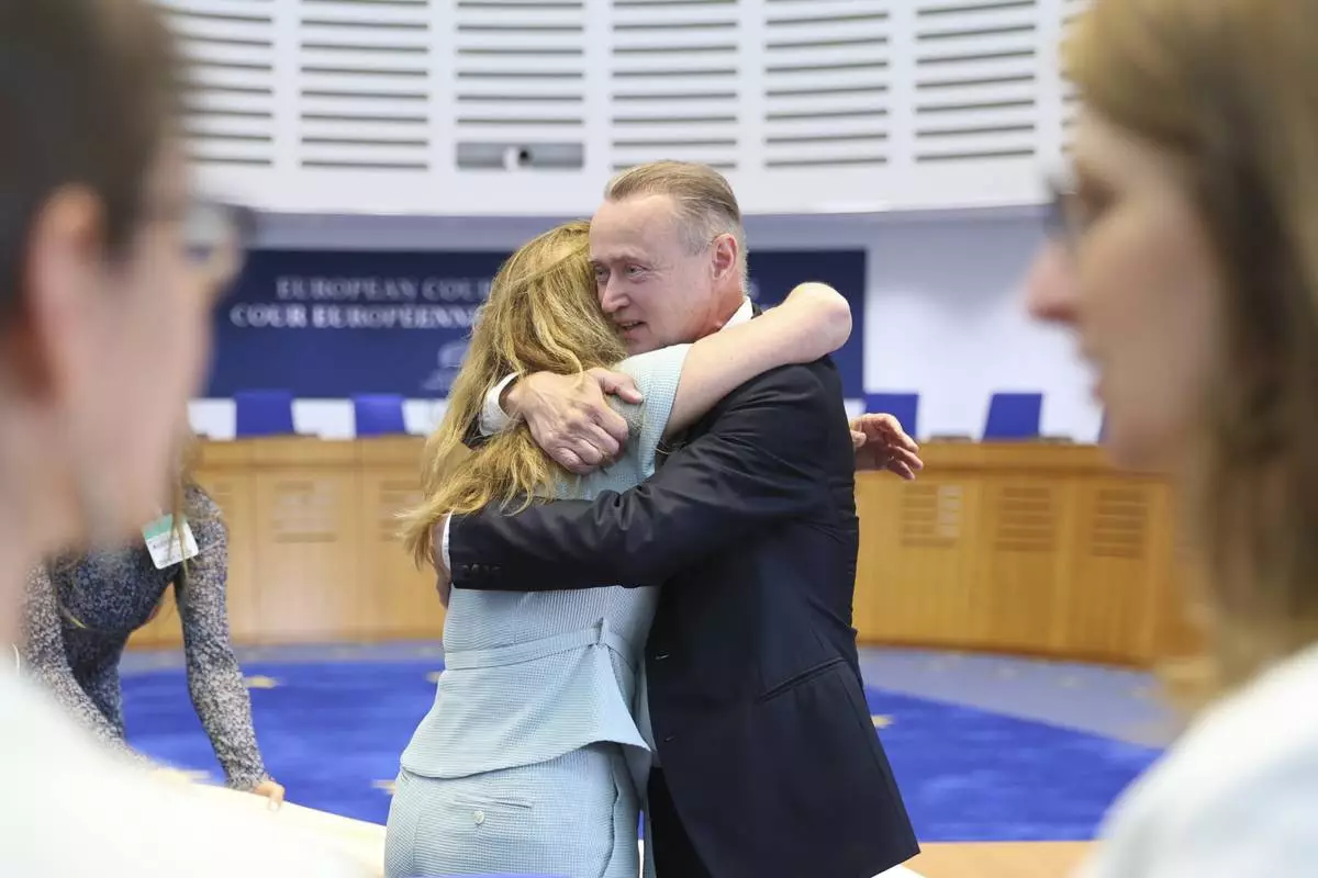 René Lefeber, right, deputy Legal Adviser of the Minister of Foreign Affairs of the Kingdom of the Netherlands, hugs agent to the European Court of Human Rights for Netherlands Babette Koopman after the European Court of Human Rights issued its judgment on Russian violations in Ukraine since 2014, including the downing of Malaysia Airlines flight MH17, Wednesday, July 9, 2025 in Strasbourg, eastern France. (AP Photo/Antonin Utz)