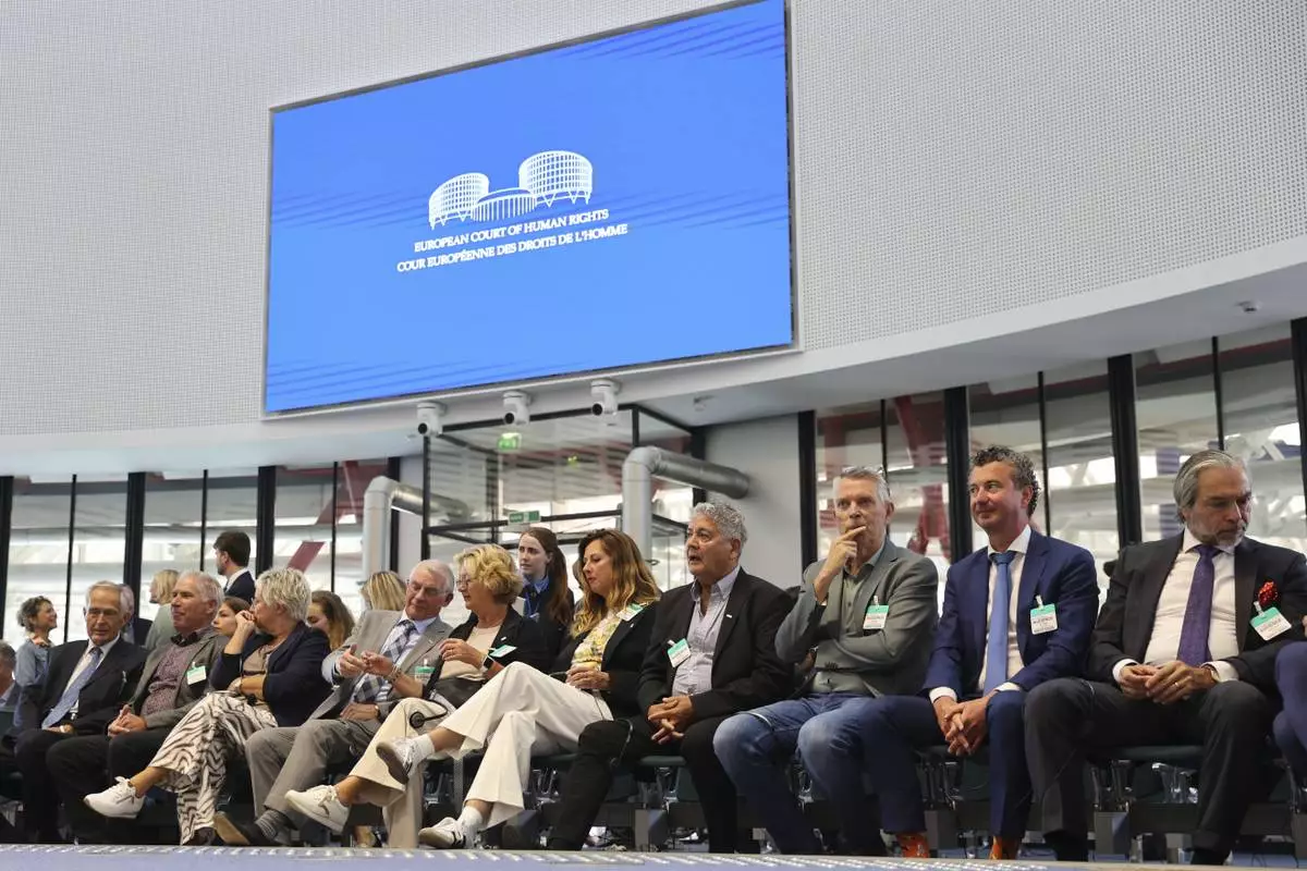 Plaintiffs sit in the European Court of Human Rights before it issues a landmark set of rulings about alleged Russian violations in Ukraine since 2014, including the downing of Malaysia Airlines flight MH17, Wednesday, July 9, 2025 in Strasbourg, eastern France. (AP Photo/Antonin Utz)
